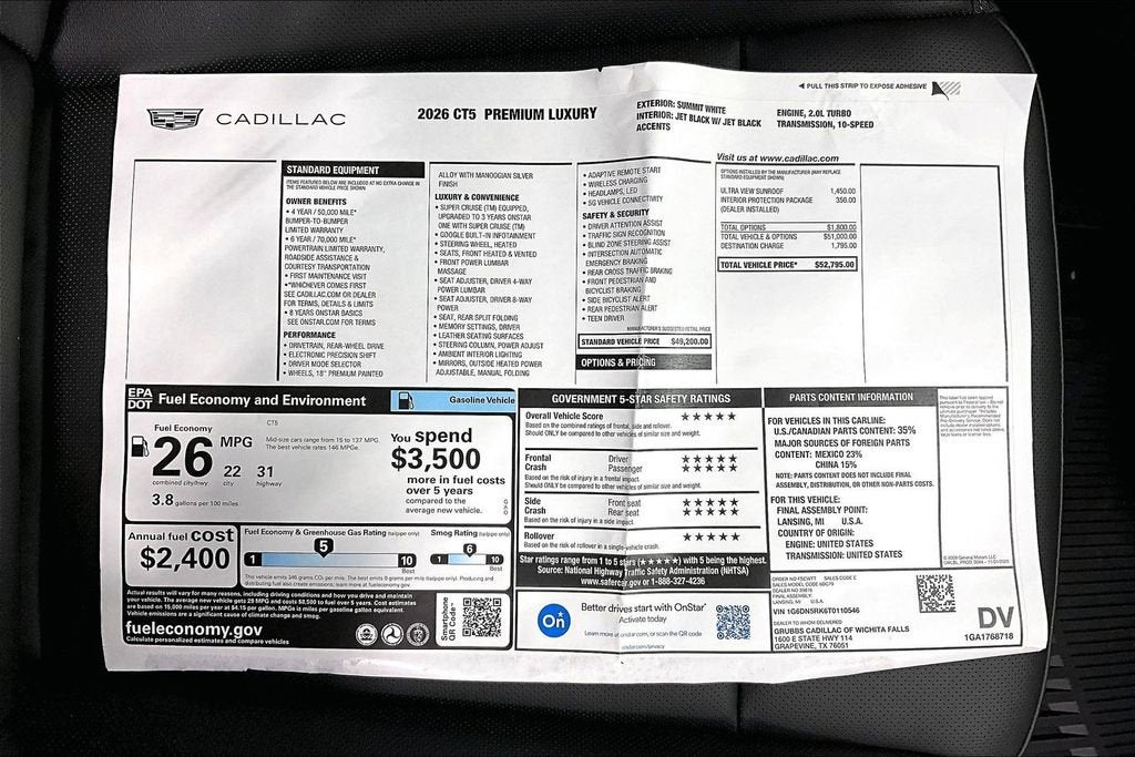 Summit White 2026 Cadillac CT5 2.0L I4 Turbocharged DOHC 16V LEV3-SULEV30 237hp 10-Speed Automatic RWD Premium Luxury