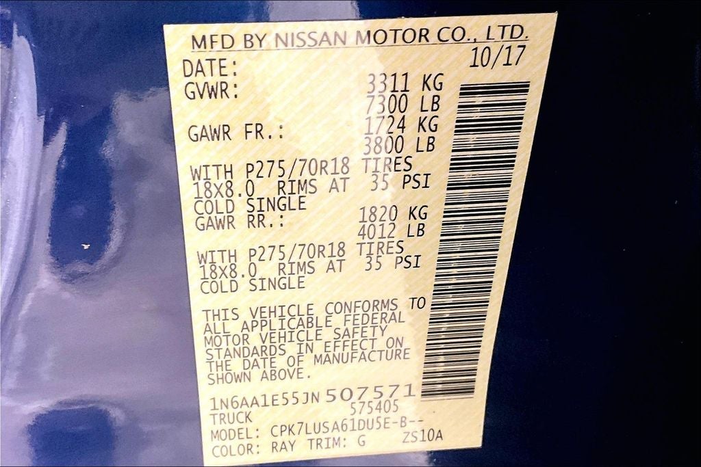 2018 Nissan Titan PRO-4X PRO-4X Deep Blue Pearl 4D Crew Cab 4WD 5.6L V8 7-Speed Automatic New Feature, Backup camera, Bluetooth®, Heated seats, Leather seats, Titan PRO-4X, 4D Crew Cab, 5.6L V8, 7-Speed Automatic, 4WD, Deep Blue Pearl, Black, 110V Outlet in Bed, 2.937 Axle Ratio, 4-Wheel Disc Brakes, 6 Speakers, ABS brakes, Air Conditioning, Alloy wheels, AM/FM radio: SiriusXM, Auto-leveling suspension, Automatic temperature control, Blind Spot Warning, Brake assist, Cargo Lamp, CD player, Cloth Seat Trim w/Vinyl Bolsters, Delay-off headlights, Driver door bin, Driver vanity mirror, Dual front impact airbags, Dual front side impact airbags, Electronic Stability Control, Front & Rear Parking Sensors, Front anti-roll bar, Front Bucket Seats, Front Captain's Chairs, Front Center Armrest, Front dual zone A/C, Front fog lights, Front reading lights, Front wheel independent suspension, Heated door mirrors, Illuminated entry, Leather Seat Trim, Leather steering wheel, LED Signature Headlamps, LED Under Rail Bed Lighting, Low tire pressure warning, Manually Extending/Folding Tow Mirrors, Navigation System, NissanConnect Services Powered By SiriusXM, Occupant sensing airbag, Outside temperature display, Overhead airbag, Overhead console, Panic alarm, Passenger door bin, Passenger vanity mirror, Power door mirrors, Power driver seat, Power Sliding Rear Window w/Defogger, Power steering, Power windows, PRO-4X Utility Package, Proximity Activation Puddle Lamps, Radio data system, Radio: NissanConnect w/SiriusXM/Navi & Mobile Apps, Rain sensing wipers, Rear anti-roll bar, Rear seat center armrest, Rear step bumper, Rear Utility Bed Step, Rear window defroster, Remote keyless entry, Rockford Fosgate Audio System w/12 Speakers, Security system, Siri Eyes Free, Speed control, Speed-sensing steering, Speed-Sensitive Wipers, Split folding rear seat, Steering wheel mounted audio controls, Tachometer, Tailgate Area Illumination, Tailgate Electronic Lock, Telescoping steering wheel, Tilt steering wheel, Traction control, Trailer Brake Controller, Trip computer, Turn signal indicator mirrors, Utilitrack System w/4 Tie-Down Cleats, Variably intermittent wipers, Voltmeter, Wheels: 18 x 8 Painted Dark Finish Alloy.