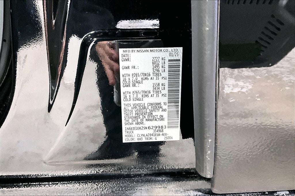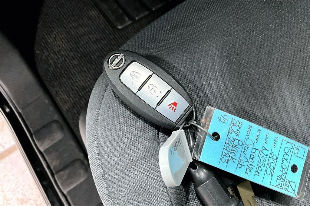 2025 Nissan Frontier S S Super Black 4D Crew Cab 4WD 3.8L DI DOHC 24V V6 9-Speed Automatic with Overdrive 1 Owner, New Feature, Apple CarPlay / Android Auto, Backup camera, Bluetooth®, Frontier S, 4D Crew Cab, 3.8L DI DOHC 24V V6, 9-Speed Automatic with Overdrive, 4WD, Super Black, Charcoal Cloth, 120V Power Outlet in Bed, 120V Power Outlet in Rear Center Console, 16 Alloy Wheels, 3.692 Axle Ratio, 4 Speakers, 4-Wheel Disc Brakes, ABS brakes, Air Conditioning, Alloy wheels, Anti-whiplash front head restraints, Apple CarPlay/Android Auto, Auto High-beam Headlights, Blind Spot Warning, Brake assist, Bumpers: body-color, Carpeted Floor Mats, Delay-off headlights, Driver door bin, Dual front impact airbags, Dual front side impact airbags, Electronic Stability Control, Emergency communication system, Front anti-roll bar, Front Bucket Seats, Front Center Armrest, Front reading lights, Front wheel independent suspension, Fully automatic headlights, Illuminated entry, Knee airbag, Low tire pressure warning, Occupant sensing airbag, Overhead airbag, Overhead console, Panic alarm, Passenger door bin, Power steering, Power windows, Radio data system, Radio: AM/FM/AUX/USB Audio System, Rear anti-roll bar, Rear side impact airbag, Rear step bumper, Remote keyless entry, S Utility Package, Speed control, Speed-sensing steering, Split folding rear seat, Spray-In Bedliner, Steering wheel mounted audio controls, Tachometer, Telescoping steering wheel, Tilt steering wheel, Traction control, Trip computer, Variably intermittent wipers.